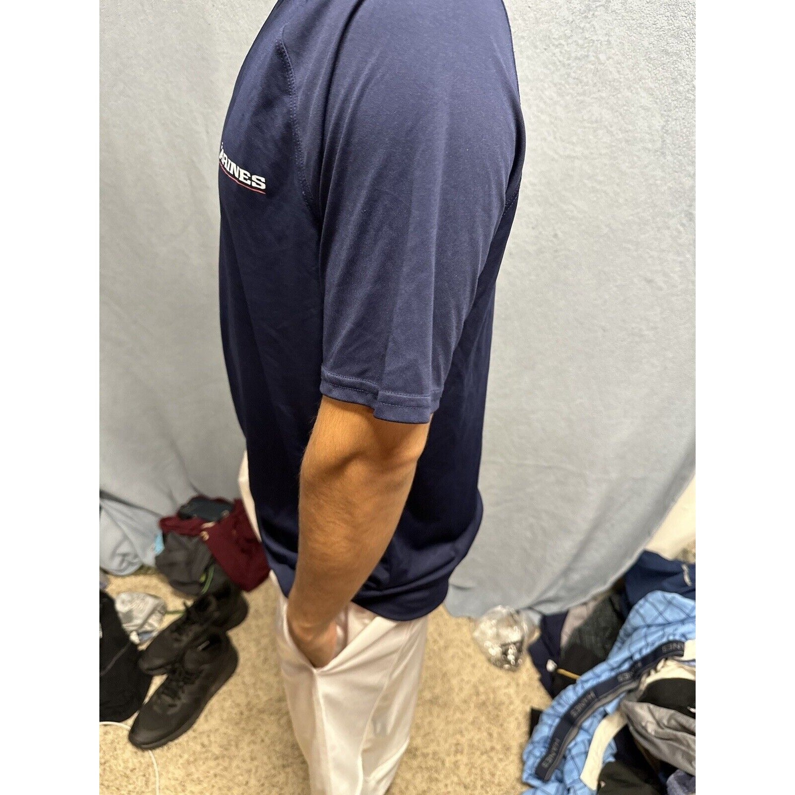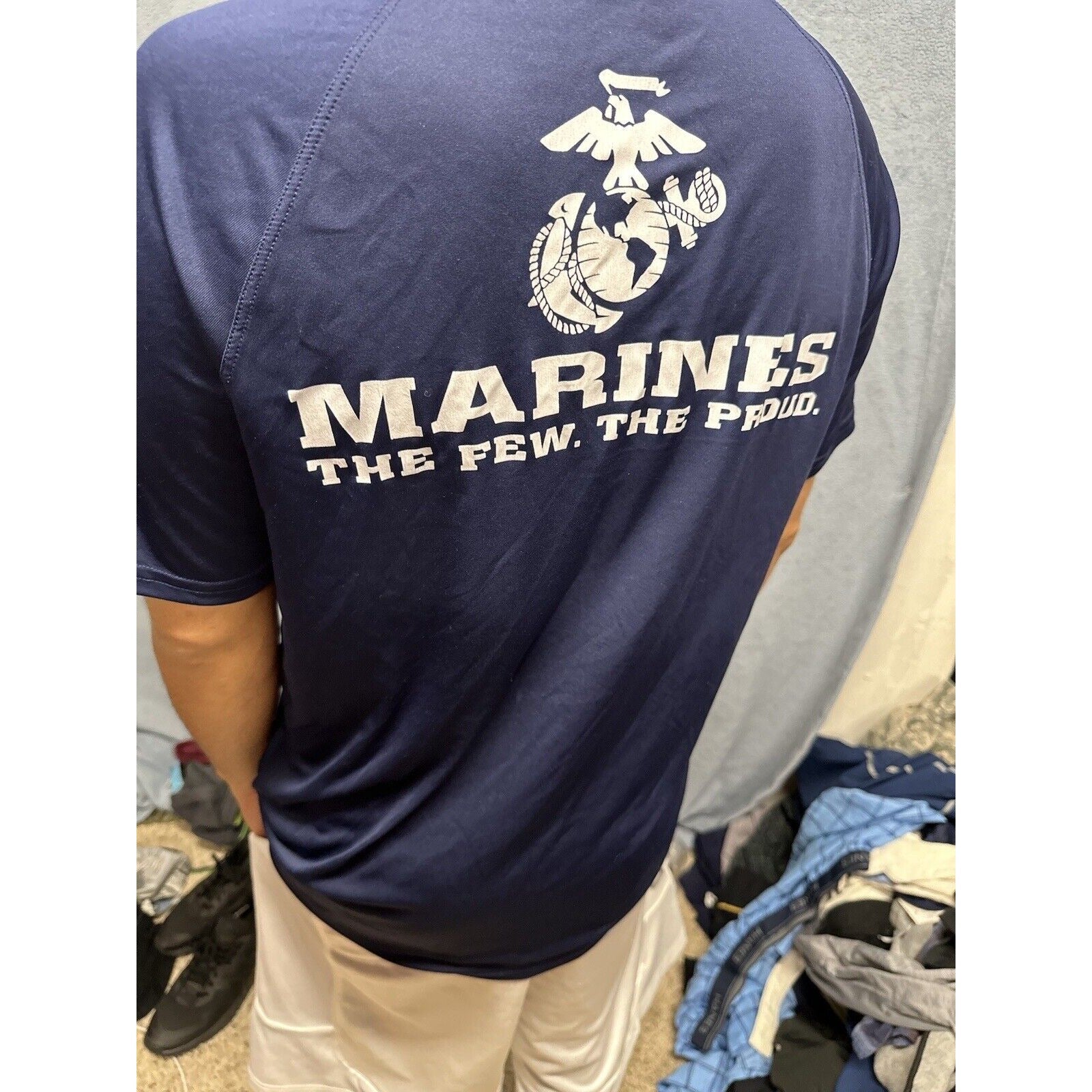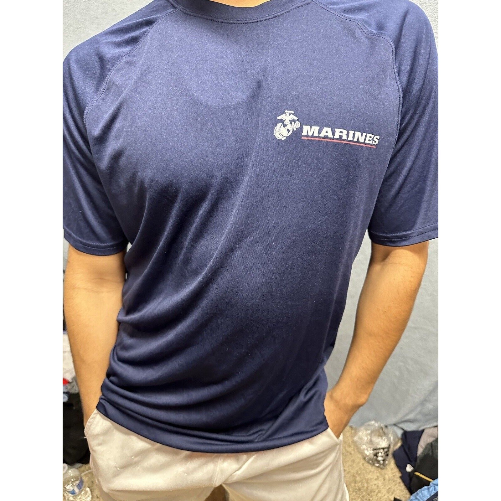 Show off your love for the Marines with this athletic compression t-shirt. The dark blue fabric wash adds a touch of style to the shirt, while the comfortable fit makes it perfect for any occasion. Made from high-quality materials, this pre-owned t-shirt is sure to last you a long time.