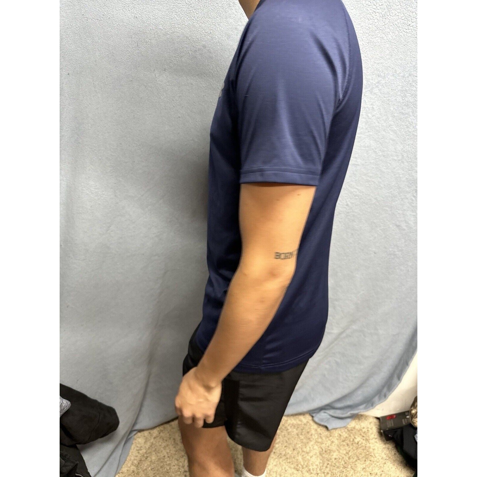 This Under Armour HeatGear T-shirt is perfect for any athletic occasion. The dark blue color and relaxed fit make it a stylish and comfortable choice. It is a pre-owned item that has been well taken care of.