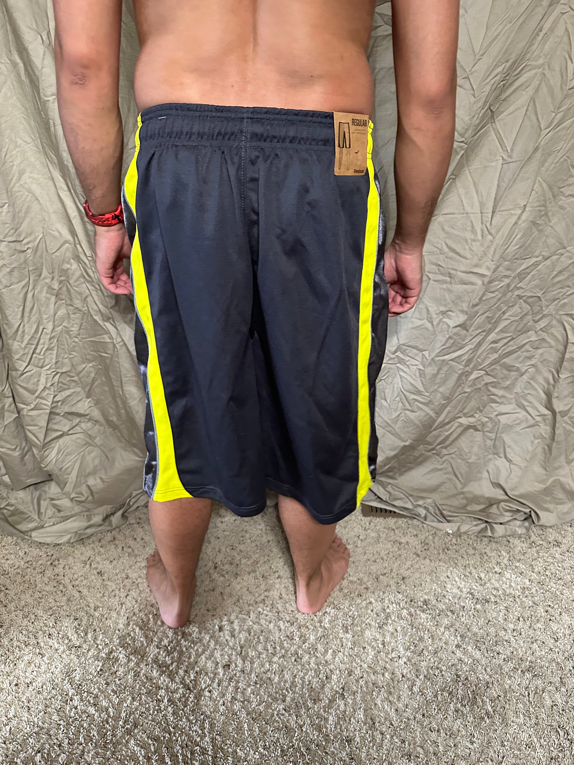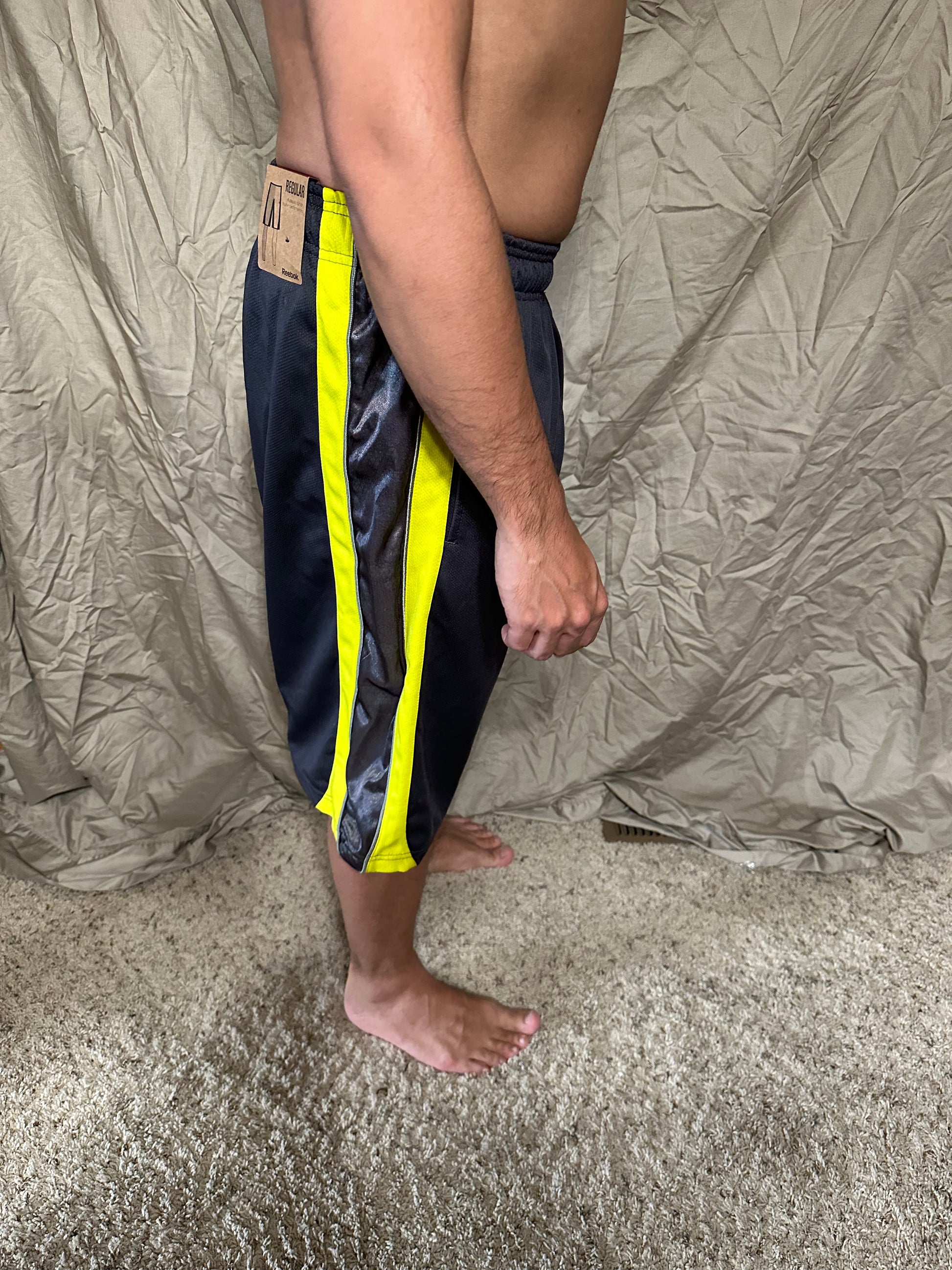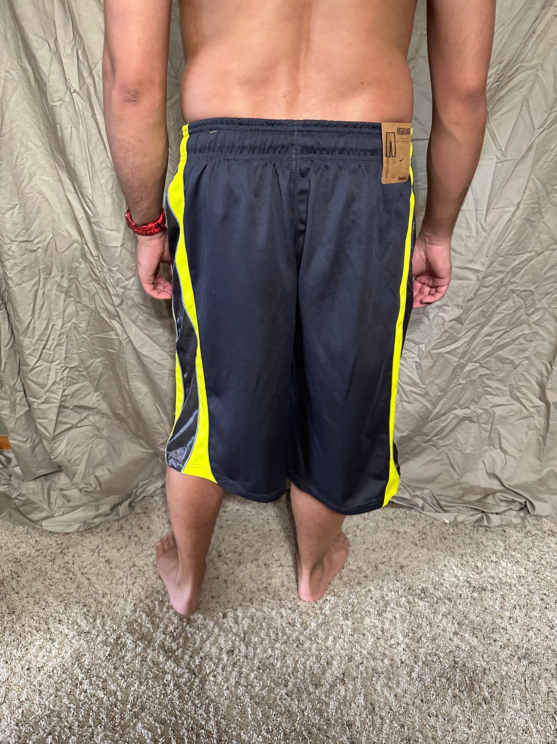 Men’s grey and yellow Reebok size medium performance athletic shorts with pockets