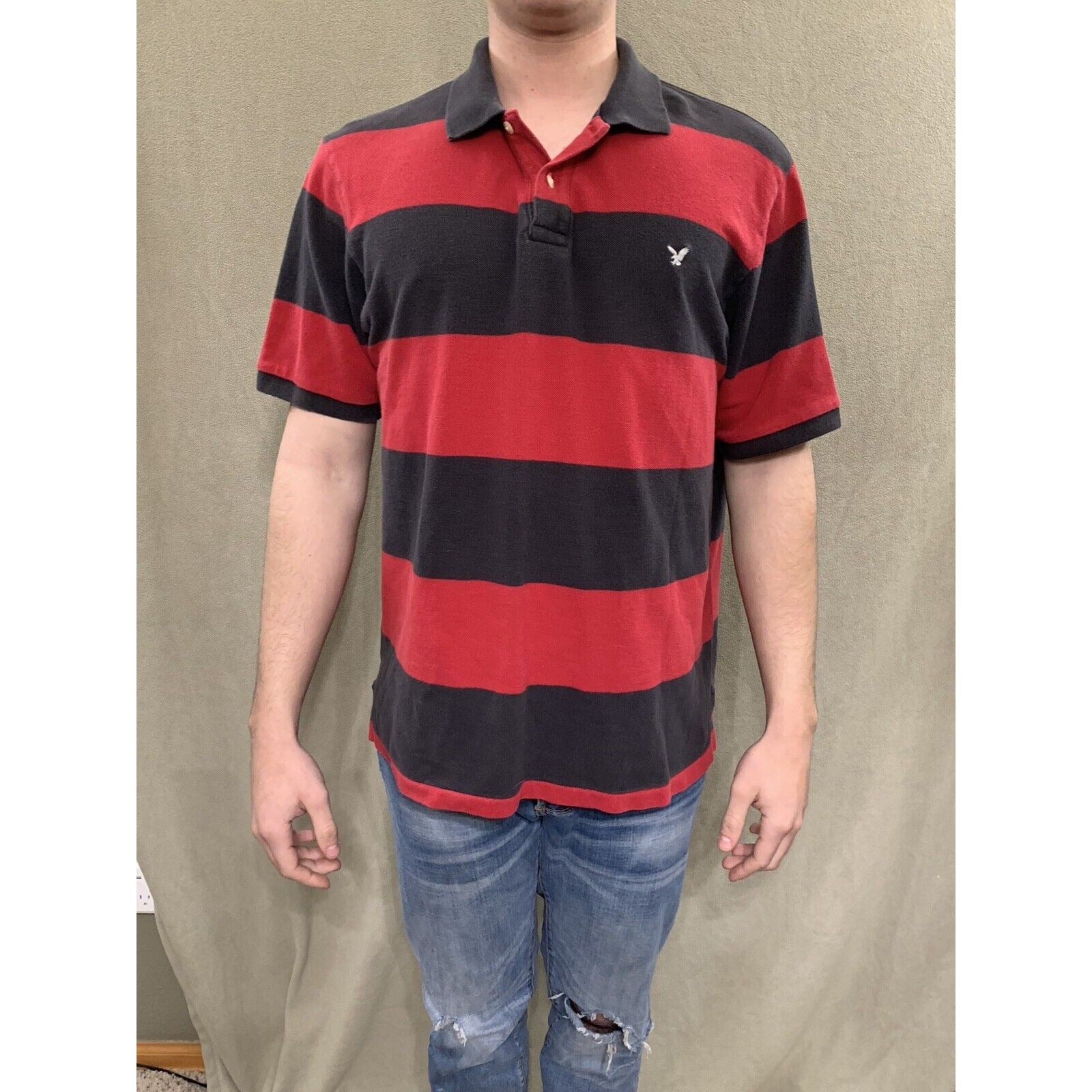 Mens American Eagle Logo Red & Black Striped Polo Short Sleeve Shirt Large. Condition is "Pre-owned".