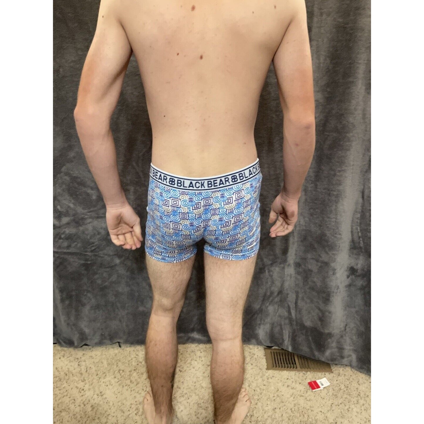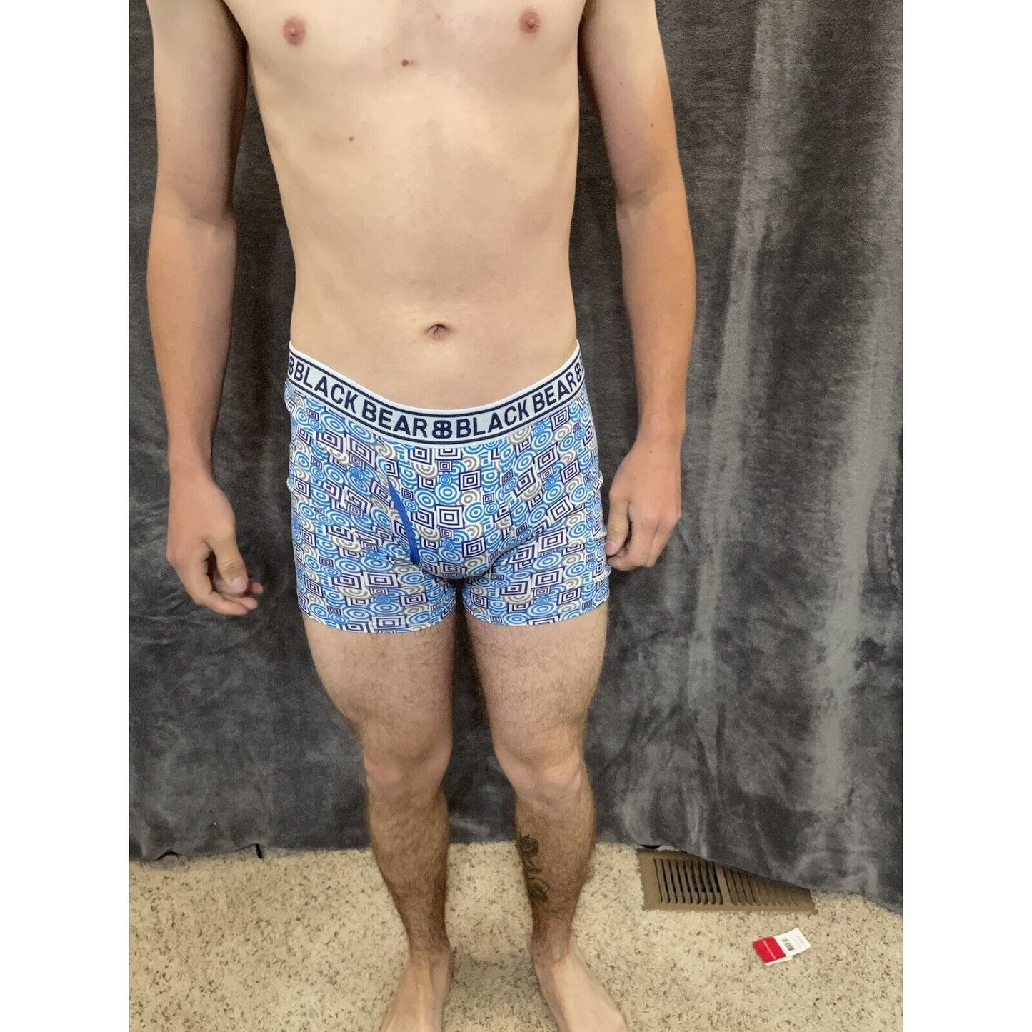 men's medium athletic trunk style black bear boxer brief blue and gray geometric design .