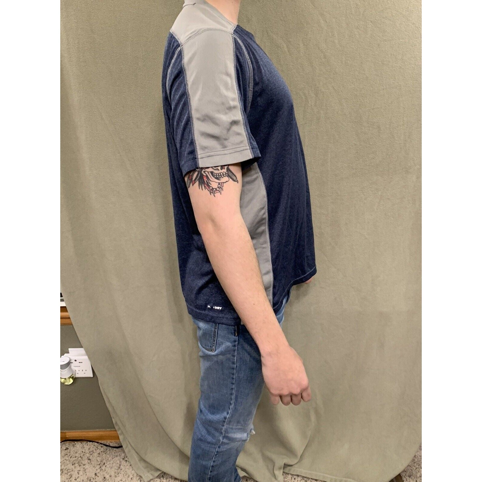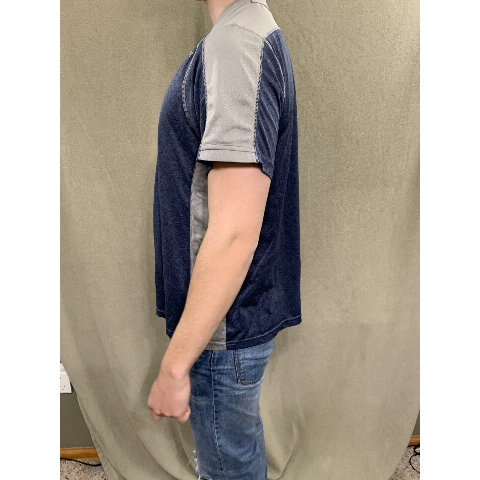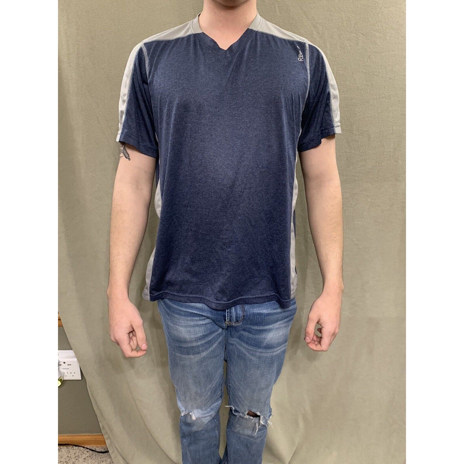 Reeebok Mens Active Short Sleeve T Shirt Size M Gray And Blue. This fits like a men’s medium. Size and some lettering has worn off. Condition is "Pre-owned".